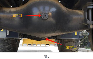 6、 事情完成后,,,,,,,将车辆停平稳,,,,,,,拉紧手制动,,,,,,,将前后桥的放油塞(图2)堵拆下,,,,,,,放出桥包里的油液,,,,,,,用备用桶网络并妥善处置惩罚。。。。将塞堵整理清洁。。。。